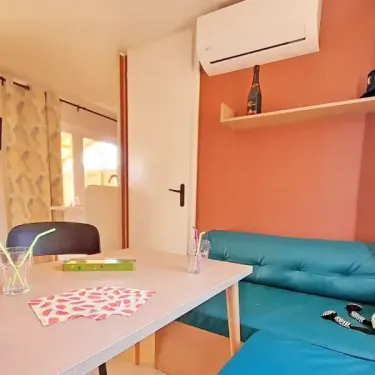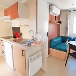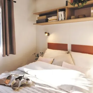 32 m² de surface, chambre avec 1 lit double, 2 chambres avec 1 lit simple + 1 lit gigogne, coin cuisine, salle d'eau, WC séparés, terrasse en bois extérieure couverte…