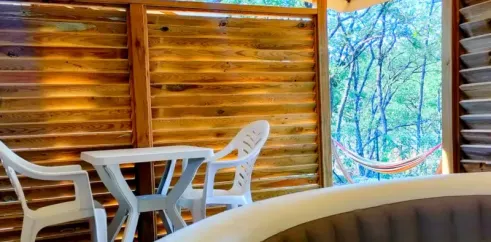 - Terrasse en bois extérieure couverte, salon de jardin, jacuzzi