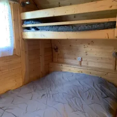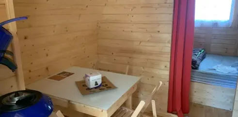 Surface de 4 m², 1 chambre avec 1 lit double (140x190) et 1 lit superposé (80x180cm), couvertures, oreillers, pas de salle de bain (sanitaires du camping), WC, terrasse semi-couverte, salon de jardin...