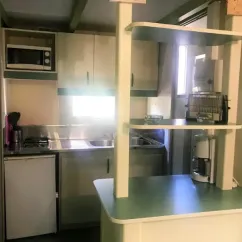 - Plaques gaz, micro-ondes, réfrigérateur, vaisselle et ustensiles de cuisine inclus, cafetière