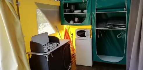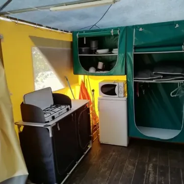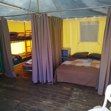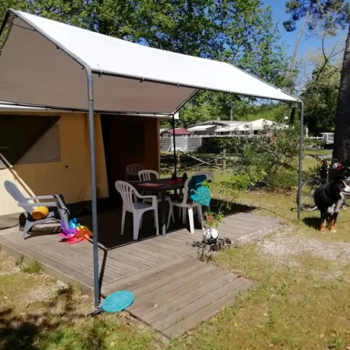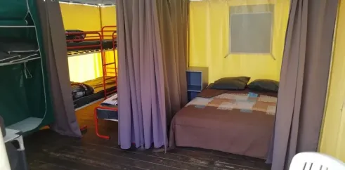 Surface de 16 m², 1 chambre avec lit double (140x190), couverture, oreillers, 1 chambre avec 2 lits simples superposés et 1 lit simple (70x190), couvertures, oreillers, pas de sanitaires (sanitaires du camping), terrasse toilée avec sol en plancher bois, salon de jardin...