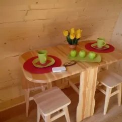 - Cuisine équipée avec cafetière senseo, bouilloire, plaque, micro-ondes, réfrigérateur, évier, vaisselle (couverts, verre, assiette, bol, tasse, ouvre-bouteille)