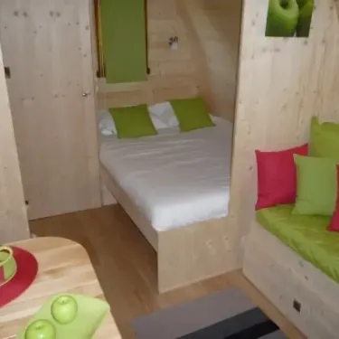 Surface de 13 m², 1 chambre avec 1 lit double (140x190), WC et lavabo, terrasse, salon de jardin...