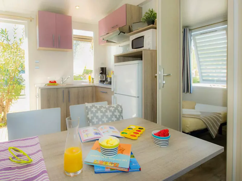 Surface de 24 m², chambre avec 1 lit double et 2 chambres avec deux lits simples, coin cuisine, salle d’eau avec WC, terrasse...