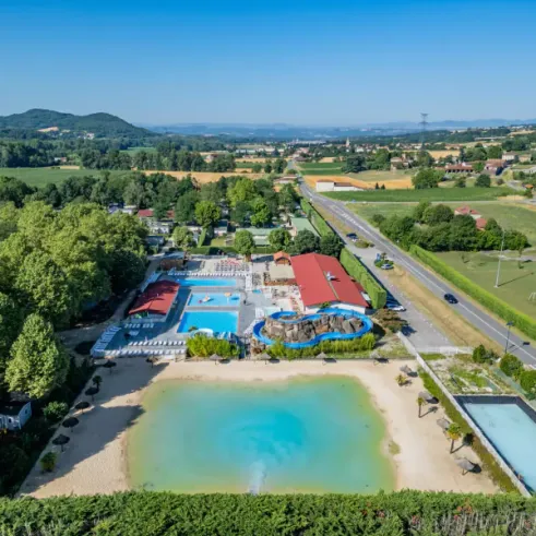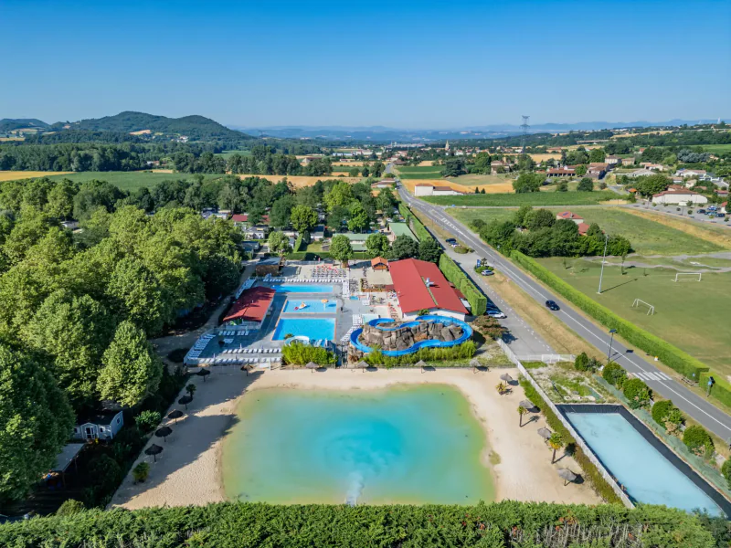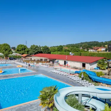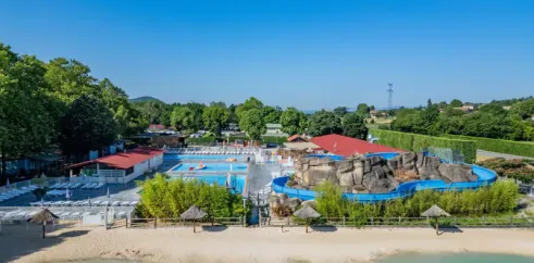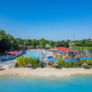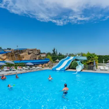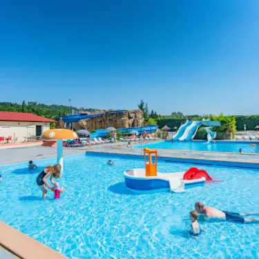 Le parc aquatique comprend plusieurs espaces avec piscine, toboggans et jeux d’eau. Un lagon avec plage aménagée complète l’offre pour varier les plaisirs et profiter pleinement des vacances.