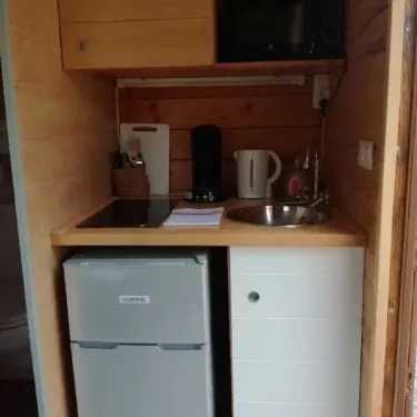 - Cuisine avec cafetière senseo, bouilloire, micro-ondes, réfrigérateur, évier, plaque vitrocéramique, vaisselle (couverts, verre, assiette, bol, tasse, casserole, poêle, ouvre-bouteille)