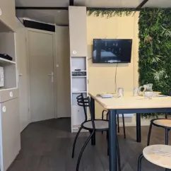 - Cuisine avec cafetière électrique, micro-onde, réfrigérateur avec congélateur, plaque à induction