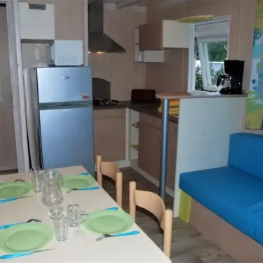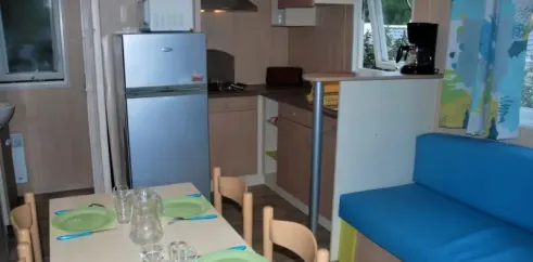 Surface de 27m², 1 chambre avec 1 lit double (140x190), 1 chambre avec 2 lits simples (80x190), 1 banquette convertible en lit double, cuisine équipée, télévision, salle de bain avec douche, WC séparés, terrasse couverte, salon de jardin...