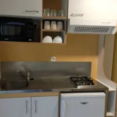 - Plaques cuisson, micro-ondes, réfrigérateur, cafetière, vaisselle et ustensiles de cuisines inclus