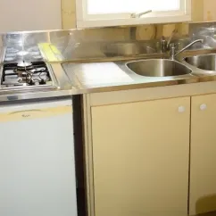 - Gazinière 4 feux, hôte, évier, frigo, cafetière électrique, micro-ondes, vaisselle et matériel cuisson