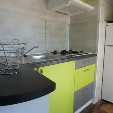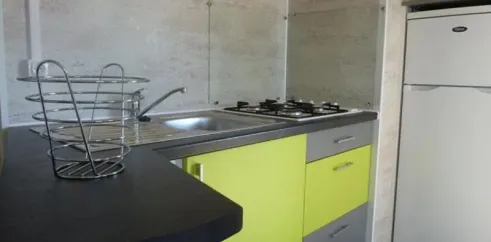 - Plaques de cuisson, évier, micro-ondes, cafetière électrique, frigo-congélateur, vaisselles et ustensiles de cuisine inclus