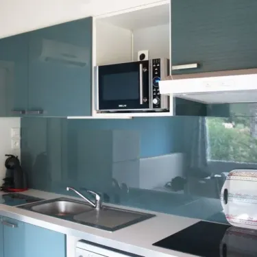 - Plaques gaz, micro-ondes, réfrigérateur, vaisselle et ustensiles de cuisine inclus, cafetière à capsules (Dolce Gusto), lave-vaisselle
