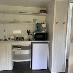 - Cuisine avec réfrigérateur, plaques, micro-ondes, cafetière électrique, vaisselle
