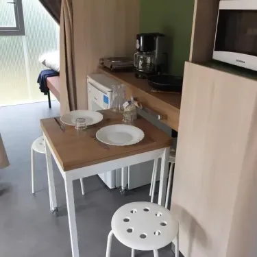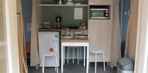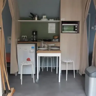 - Cuisine avec réfrigérateur, plaques, micro-ondes, cafetière électrique, vaisselle