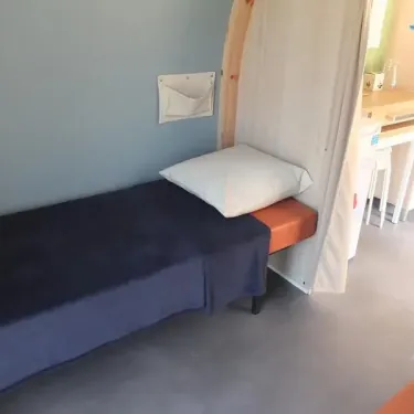 Surface de 16 m², 1 chambre avec 1 lit double (140x190), couverture, oreillers, 1 chambre avec 2 lits simples (80x190), couvertures, oreillers, pas de sanitaires (sanitaires du camping), terrasse semi-couverte, salon de jardin...