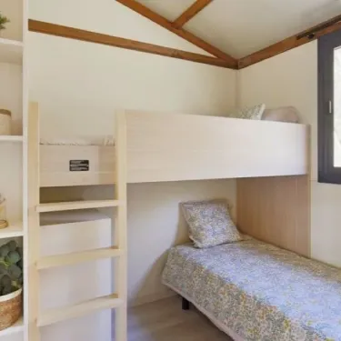 Surface de 26m², 1 chambre avec 1 lit double, 2 chambres avec 2 lits simples ou superposés, salle d'eau avec lavabo, douche et WC séparés, cuisine équipée, télévision, terrasse avec salon de jardin...
