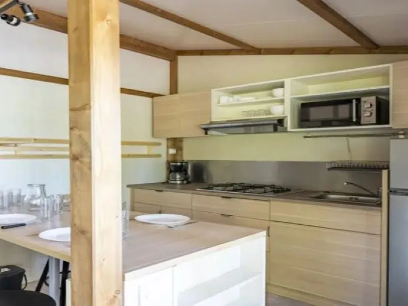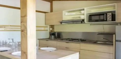 - Plaques cuisson, micro-ondes, réfrigérateur-congélateur, cafetière, vaisselle et ustensiles de cuisines inclus