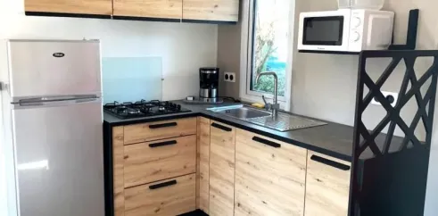 - Plaques cuisson, micro-ondes, réfrigérateur, cafetière, vaisselle et ustensiles de cuisines inclus