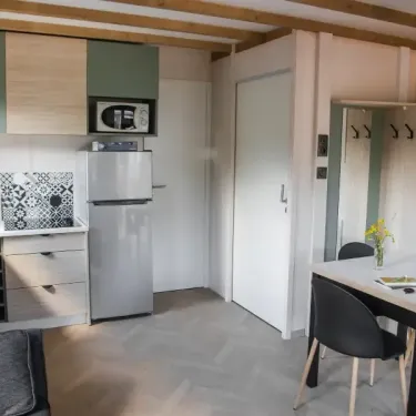 - Plaques cuisson, micro-ondes, réfrigérateur, vaisselle et ustensiles de cuisines inclus