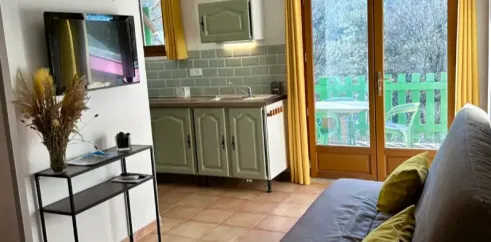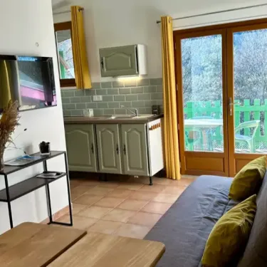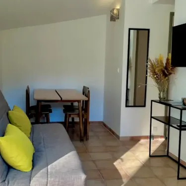 - Séjour avec table, chaises et canapé, climatisation, télévision