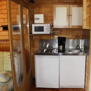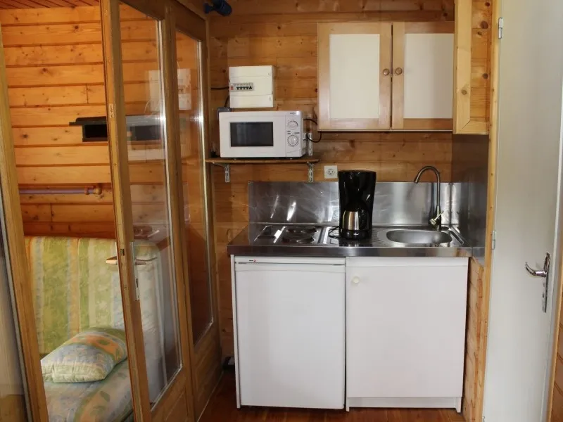 25m² de surface, une chambre avec un lit double, une chambre avec un lit superposé, coin cuisine, salle de douche avec WC, terrasse...