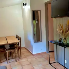 - Séjour avec table, chaises et canapé, climatisation, télévision