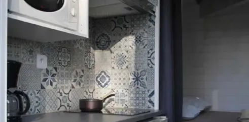 - Plaque deux feux électrique, réfrigérateur, micro-onde, vaisselle et ustensiles de cuisine inclus, cafetière électrique