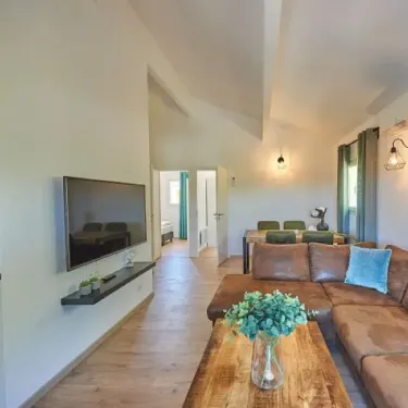 - Coin salon avec télévision, table et chaises, canapé lit double