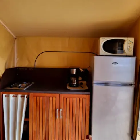 - Plaques cuisson, micro-ondes, réfrigérateur/congélateur, cafetière, vaisselle et ustensiles de cuisines inclus