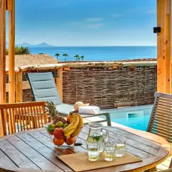 Le Lodge Luxe Riviera vue mer panoramique (50m²) est composé d'un Lodge Luxe 2 chambres ainsi qu'une cabane aménagée.