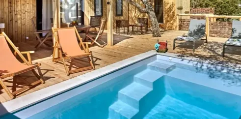 Surface de 50m², 1 suite parentale lit double (160x200cm) avec douche à l'italienne (80x120cm) et WC, 1 chambre avec 2 lits simples (80x190), cuisine équipée, climatisation, télévision, salle de bain avec douche, WC séparés, terrasse semi-couverte, salon de jardin, piscine privée...