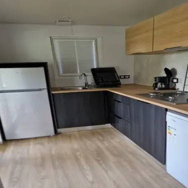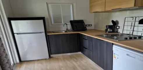 - Plaques cuisson, micro-ondes, réfrigérateur/congélateur, cafetière, vaisselle et ustensiles de cuisines inclus