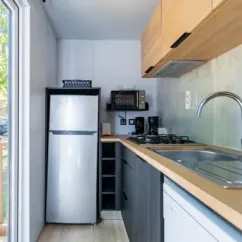 - Plaques cuisson, cafetière, micro-ondes, réfrigérateur, lave-vaisselle, vaisselle et ustensiles de cuisines inclus