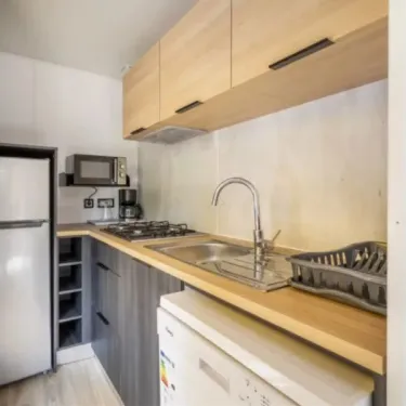 - Plaques cuisson, micro-ondes, réfrigérateur-congélateur, cafetière, lave-vaisselle, vaisselle et ustensiles de cuisines inclus