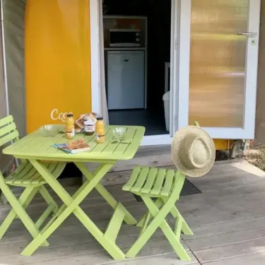 Surface de 11 m², 1 chambre avec 1 lit double (140x190), couverture, oreillers, pas de sanitaires (sanitaires du camping), terrasse semi-couverte, salon de jardin...