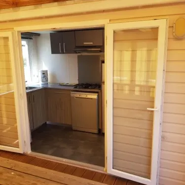 Superficie d'environ 35 m² avec une chambre avec un lit double, une chambre avec deux lits simples, séjour convertible, coin repas, coin cuisine, douche avec WC séparés, terrasse en bois semi-couverte...