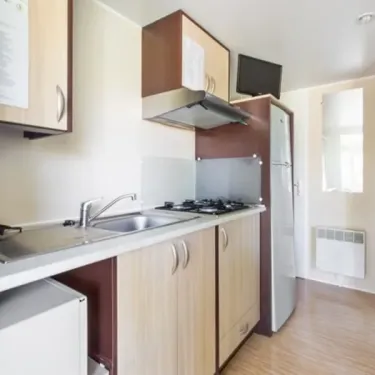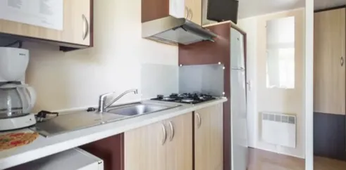 Mobil Home de 24m², une chambre avec 1 lit double, une chambre avec 2 lits simples, séjour convertible, coin cuisine, télévision, douche avec WC séparés, terrasse couverte...