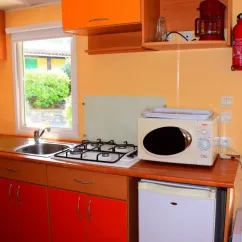 - Gazinière 4 feux, hôte, évier, frigo, cafetière électrique, micro-ondes, vaisselle et matériel cuisson