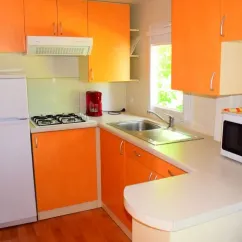 - Gazinière 4 feux, hôte, évier, frigo, cafetière électrique, micro-ondes, vaisselle et matériel cuisson, lave-linge