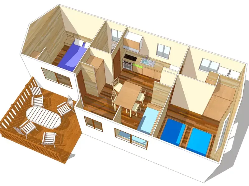 30 m² de surface, 1 chambre avec 1 lit double, 1 chambre avec 2 lits simples, banquette convertible, climatisation, coin cuisine, salle de douche avec WC séparés ou non, terrasse...