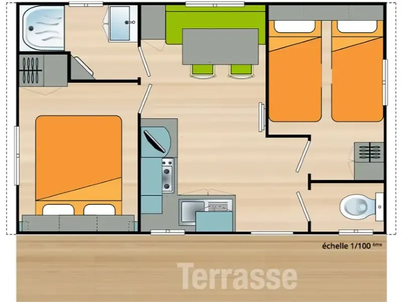 20 m² de surface, chambre parents avec 1 lit de 140 x 190 cm, chambre avec 2 lits simples de 70 ou 80 x 190 cm, coin cuisine, douche, lavabo, WC, terrasse...