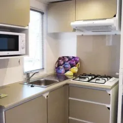 - Plaques gaz, micro-ondes, grand réfrigérateur, vaisselle et ustensiles de cuisine inclus, cafetière à capsules (Dolce Gusto)