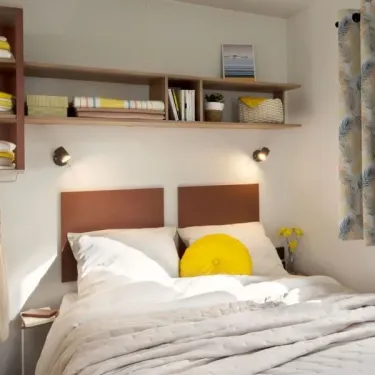 24.7 m² de surface, chambre avec 1 lit double, 1 chambre avec 2 lits simples, coin cuisine, salle d'eau, WC séparés, terrasse intégrée en bois…