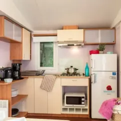 - Cafetière électrique à filtre, cuisine équipée, évier, micro-ondes, plaque de cuisson 4 feux gaz, réfrigérateur avec freezer