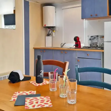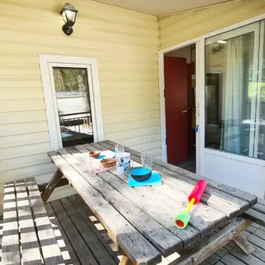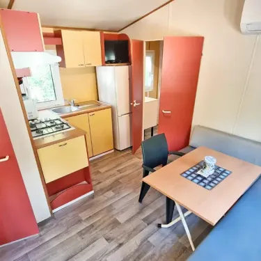 28 m² de surface, chambre avec 1 lit double, 1 chambre avec 2 lits simples, banquette convertible en lit double, coin cuisine, salle d'eau, WC, terrasse en bois…