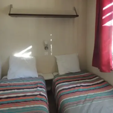 Surface de 32 m², 1 chambre avec 1 lit double (140x190), couverture, oreillers, 2 chambres avec 2 lits simples (90x190), couvertures, oreillers, salle de bain avec douche, WC séparés, terrasse couverte, salon de jardin...