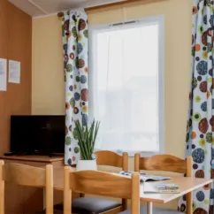 Surface de 31 m², 1 chambre avec 1 lit double (140x190), couverture, oreillers, 1 chambre avec 2 lits simples (80x190), couvertures, oreillers, salle de bain avec douche, WC séparés, terrasse couverte, salon de jardin...