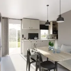Une chambre avec un lit double, une chambre avec deux lits simples, banquette d'angle, coin cuisine, salle de douche, WC séparés, terrasse semi-couverte...
