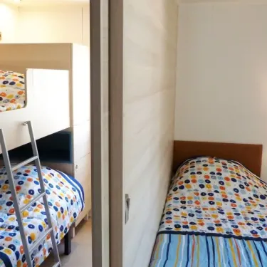 - Enfants : 1 chambre avec 2 lits simples (80x190) + 1 chambre avec 2 lits simples superposés (80x180 + 70x180)