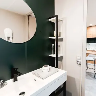- Plaque gaz 4 feux, frigo congélateur, micro-ondes, cafetière électrique, grille pain, bouilloire